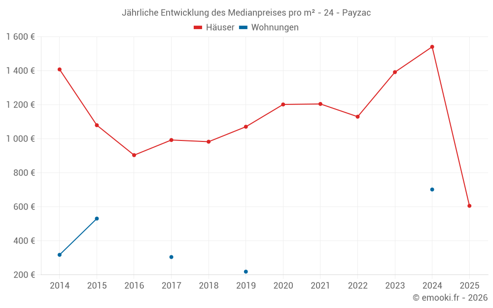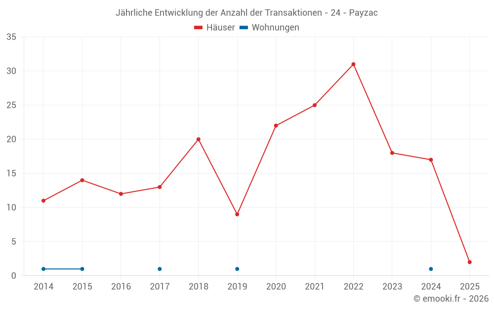 Der Durchschnittspreis auf den 30 Hausgeschäften der letzten 24 Monate in der Gemeinde Payzac betrug 1 406 € pro Quadratmeter für einen mittleren Immobilienwert von 125 000 €. Über diesen Zeitraum hinweg lagen 60% der Transaktionen zwischen 771 und 1 910 € pro Quadratmeter (vom 2. bis zum 8. Dezil).