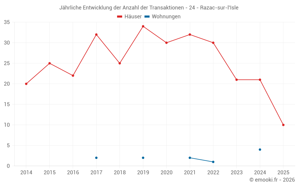 Der Durchschnittspreis auf den 24 Hausgeschäften der letzten 12 Monate in der Gemeinde Razac-sur-l'Isle betrug 1 721 € pro Quadratmeter für einen mittleren Immobilienwert von 161 500 €. Über diesen Zeitraum hinweg lagen 60% der Transaktionen zwischen 1 361 und 2 111 € pro Quadratmeter (vom 2. bis zum 8. Dezil).