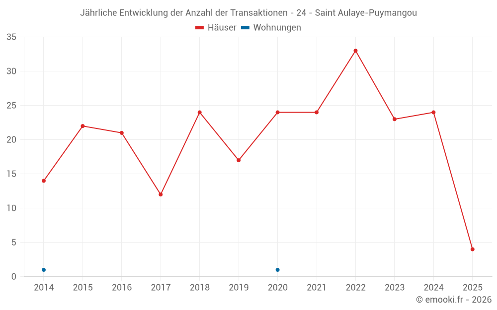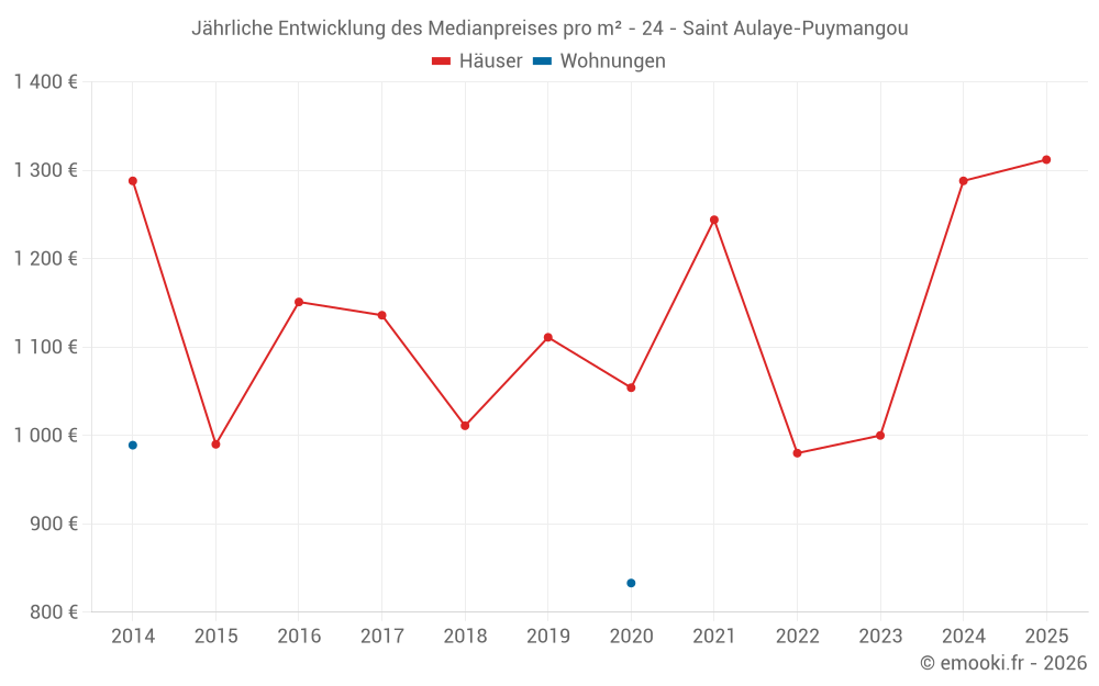 Der Durchschnittspreis auf den 16 Hausgeschäften der letzten 12 Monate in der Gemeinde Saint Aulaye-Puymangou betrug 1 364 € pro Quadratmeter für einen mittleren Immobilienwert von 135 000 €. Über diesen Zeitraum hinweg lagen 60% der Transaktionen zwischen 1 000 und 1 978 € pro Quadratmeter (vom 2. bis zum 8. Dezil).
