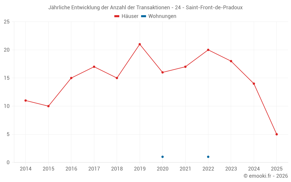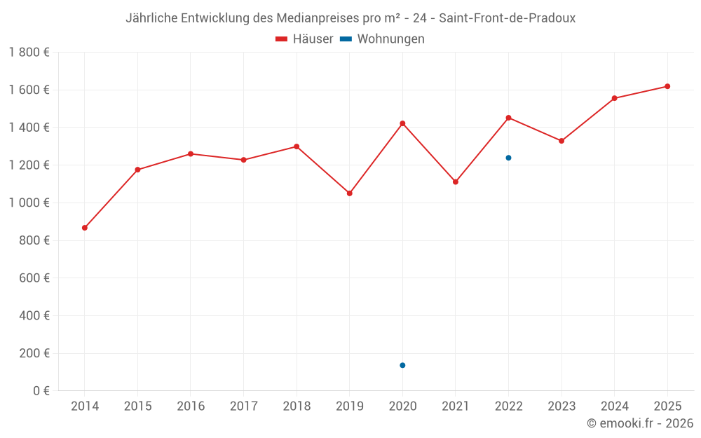 Der Durchschnittspreis auf den 30 Hausgeschäften der letzten 24 Monate in der Gemeinde Saint-Front-de-Pradoux betrug 1 556 € pro Quadratmeter für einen mittleren Immobilienwert von 126 947 €. Über diesen Zeitraum hinweg lagen 60% der Transaktionen zwischen 925 und 1 760 € pro Quadratmeter (vom 2. bis zum 8. Dezil).