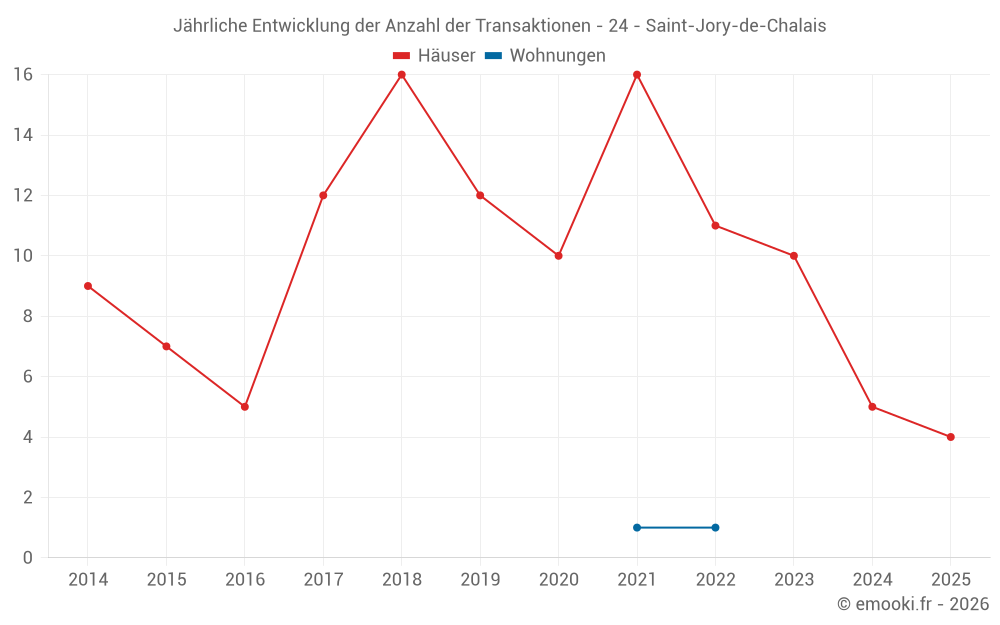 Der Durchschnittspreis auf den 14 Hausgeschäften der letzten 24 Monate in der Gemeinde Saint-Jory-de-Chalais betrug 1 701 € pro Quadratmeter für einen mittleren Immobilienwert von 133 000 €. Über diesen Zeitraum hinweg lagen 60% der Transaktionen zwischen 890 und 2 261 € pro Quadratmeter (vom 2. bis zum 8. Dezil).