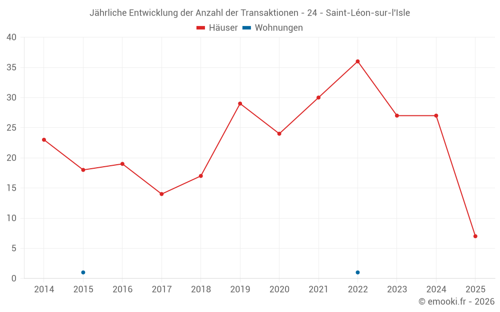 Der Durchschnittspreis auf den 24 Hausgeschäften der letzten 12 Monate in der Gemeinde Saint-Léon-sur-l'Isle betrug 1 384 € pro Quadratmeter für einen mittleren Immobilienwert von 117 410 €. Über diesen Zeitraum hinweg lagen 60% der Transaktionen zwischen 898 und 1 698 € pro Quadratmeter (vom 2. bis zum 8. Dezil).