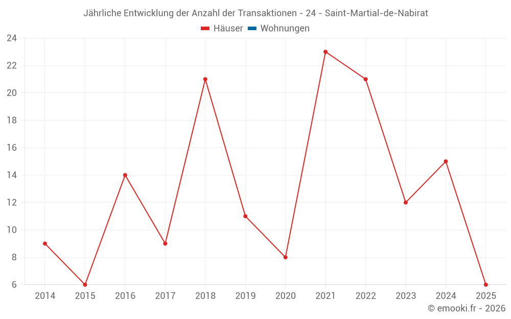 Der Durchschnittspreis auf den 26 Hausgeschäften der letzten 24 Monate in der Gemeinde Saint-Martial-de-Nabirat betrug 1 703 € pro Quadratmeter für einen mittleren Immobilienwert von 187 000 €. Über diesen Zeitraum hinweg lagen 60% der Transaktionen zwischen 1 103 und 2 263 € pro Quadratmeter (vom 2. bis zum 8. Dezil).