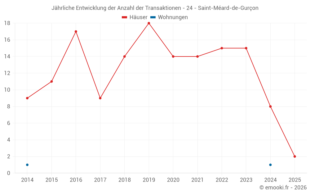 Der Durchschnittspreis auf den 15 Hausgeschäften der letzten 24 Monate in der Gemeinde Saint-Méard-de-Gurçon betrug 1 174 € pro Quadratmeter für einen mittleren Immobilienwert von 157 000 €. Über diesen Zeitraum hinweg lagen 60% der Transaktionen zwischen 553 und 1 682 € pro Quadratmeter (vom 2. bis zum 8. Dezil).
