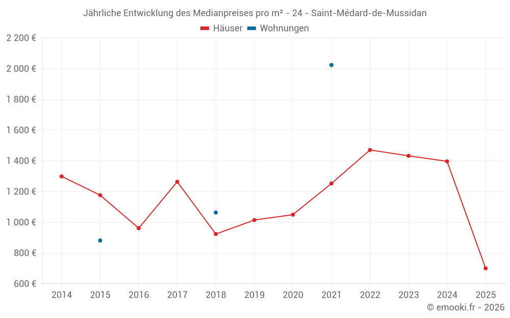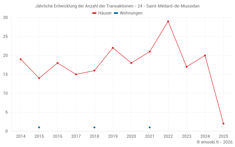 Der Durchschnittspreis auf den 29 Hausgeschäften der letzten 24 Monate in der Gemeinde Saint-Médard-de-Mussidan betrug 1 380 € pro Quadratmeter für einen mittleren Immobilienwert von 118 750 €. Über diesen Zeitraum hinweg lagen 60% der Transaktionen zwischen 716 und 1 853 € pro Quadratmeter (vom 2. bis zum 8. Dezil).