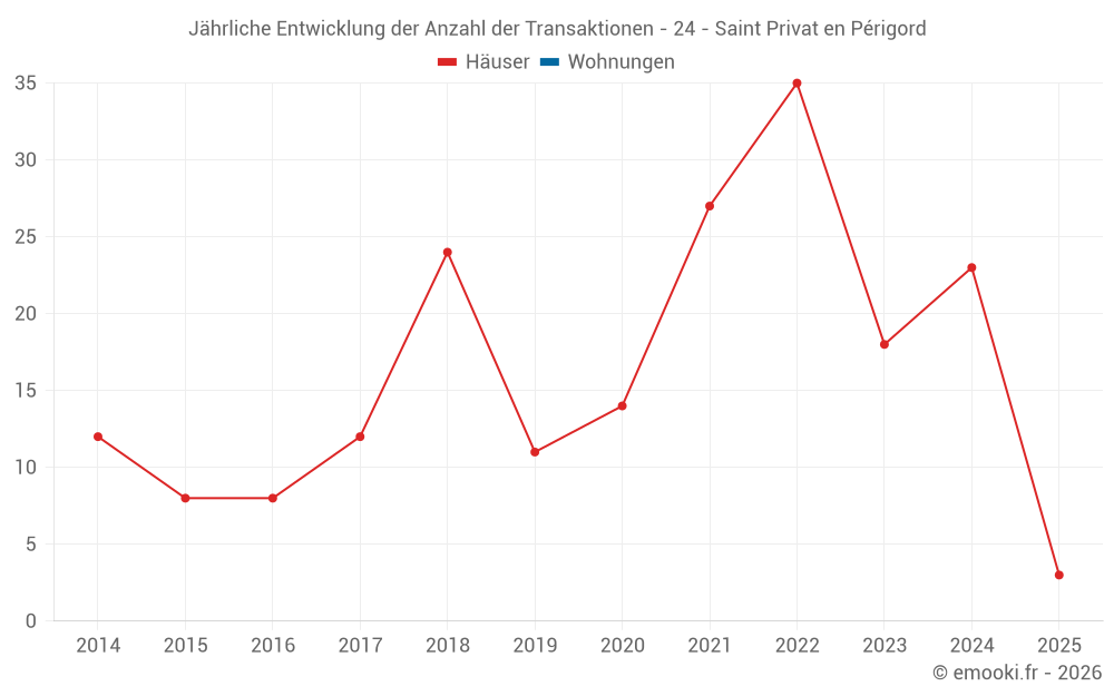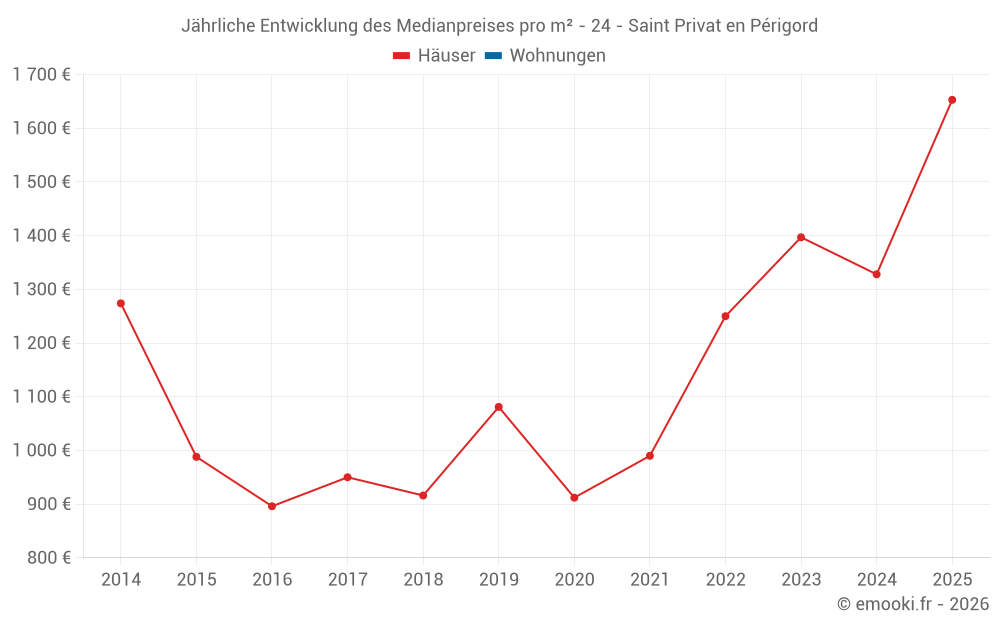 Der Durchschnittspreis auf den 31 Hausgeschäften der letzten 24 Monate in der Gemeinde Saint Privat en Périgord betrug 1 328 € pro Quadratmeter für einen mittleren Immobilienwert von 170 000 €. Über diesen Zeitraum hinweg lagen 60% der Transaktionen zwischen 935 und 1 845 € pro Quadratmeter (vom 2. bis zum 8. Dezil).