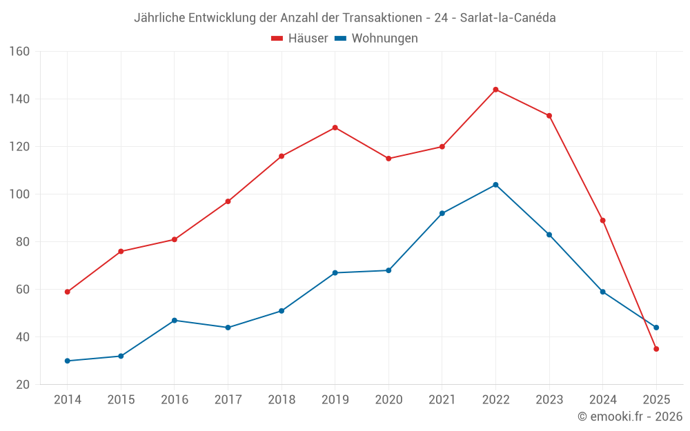Der Durchschnittspreis auf den 44 Wohnungstransaktionen der letzten 6 Monate in der Gemeinde Sarlat-la-Canéda betrug 1 796 € pro Quadratmeter für einen mittleren Immobilienwert von 105 000 €. Über diesen Zeitraum hinweg lagen 60% der Transaktionen zwischen 1 444 und 2 056 € pro Quadratmeter (vom 2. bis zum 8. Dezil).