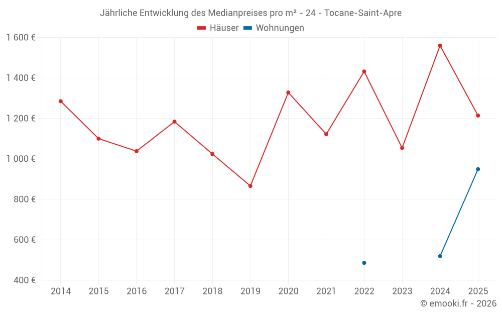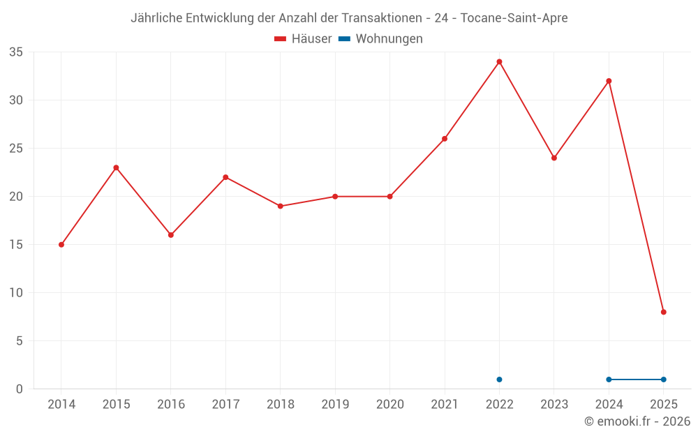 Der Durchschnittspreis auf den 25 Hausgeschäften der letzten 12 Monate in der Gemeinde Tocane-Saint-Apre betrug 1 439 € pro Quadratmeter für einen mittleren Immobilienwert von 135 000 €. Über diesen Zeitraum hinweg lagen 60% der Transaktionen zwischen 890 und 2 026 € pro Quadratmeter (vom 2. bis zum 8. Dezil).