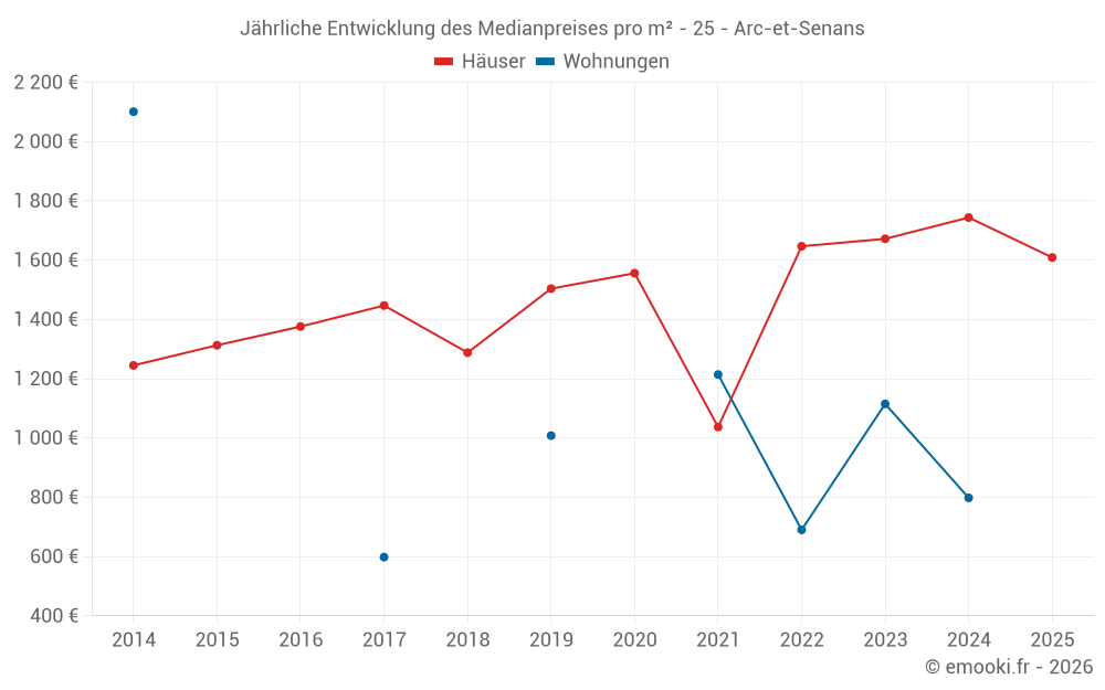 Der Durchschnittspreis auf den 25 Hausgeschäften der letzten 24 Monate in der Gemeinde Arc-et-Senans betrug 1 719 € pro Quadratmeter für einen mittleren Immobilienwert von 185 750 €. Über diesen Zeitraum hinweg lagen 60% der Transaktionen zwischen 1 108 und 2 312 € pro Quadratmeter (vom 2. bis zum 8. Dezil).