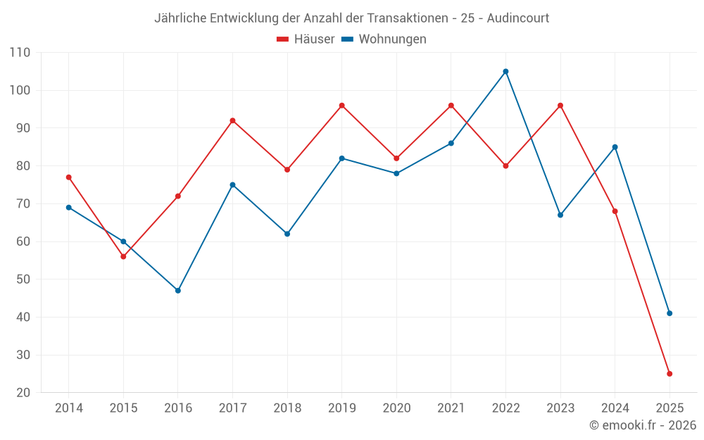 Der Durchschnittspreis auf den 25 Hausgeschäften der letzten 6 Monate in der Gemeinde Audincourt betrug 1 250 € pro Quadratmeter für einen mittleren Immobilienwert von 118 480 €. Über diesen Zeitraum hinweg lagen 60% der Transaktionen zwischen 818 und 1 809 € pro Quadratmeter (vom 2. bis zum 8. Dezil).