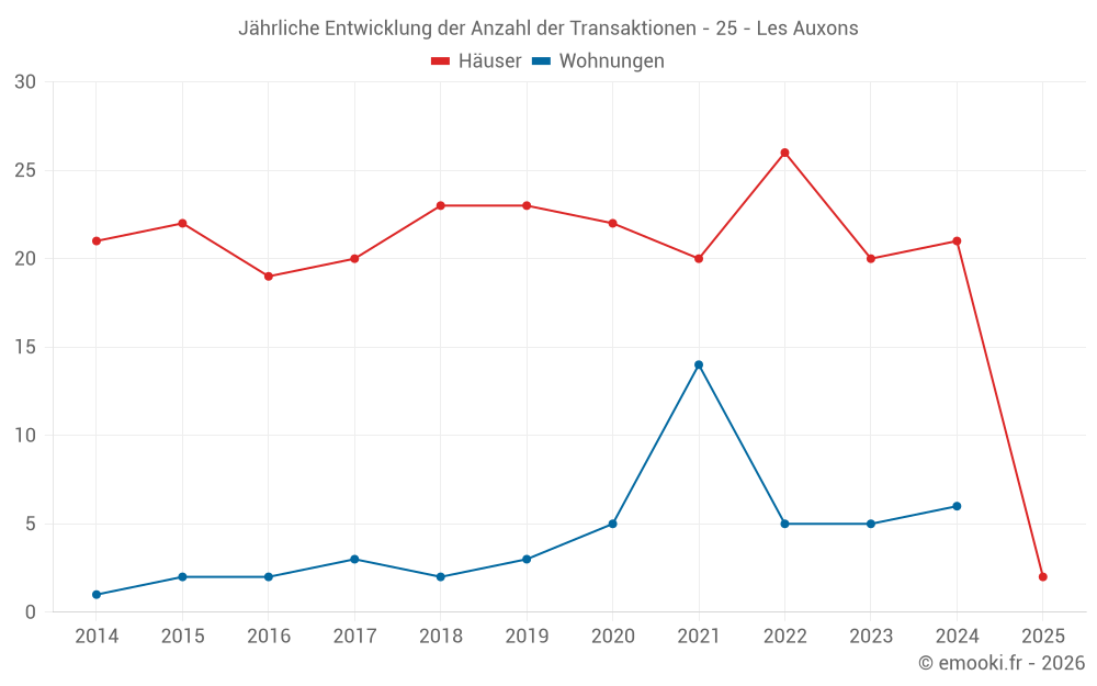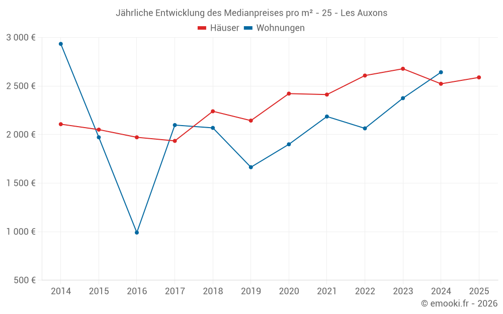 Der Durchschnittspreis auf den 38 Hausgeschäften der letzten 24 Monate in der Gemeinde Les Auxons betrug 2 600 € pro Quadratmeter für einen mittleren Immobilienwert von 249 150 €. Über diesen Zeitraum hinweg lagen 60% der Transaktionen zwischen 2 072 und 3 007 € pro Quadratmeter (vom 2. bis zum 8. Dezil).