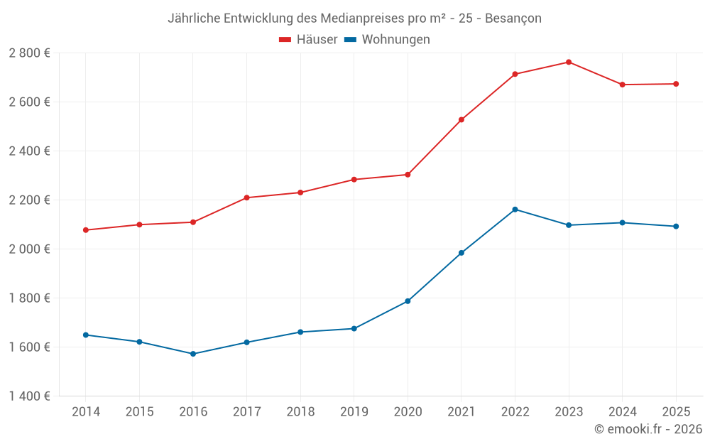 Der Durchschnittspreis auf den 28 Hausgeschäften der letzten 3 Monate in der Gemeinde Besançon betrug 2 811 € pro Quadratmeter für einen mittleren Immobilienwert von 270 148 €. Über diesen Zeitraum hinweg lagen 60% der Transaktionen zwischen 2 314 und 3 500 € pro Quadratmeter (vom 2. bis zum 8. Dezil).