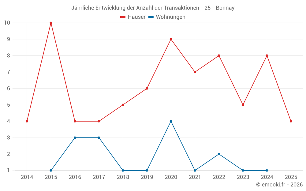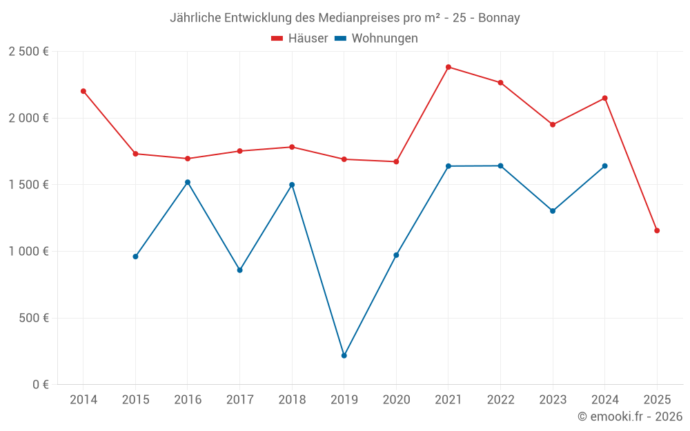 Der Durchschnittspreis auf den 15 Hausgeschäften der letzten 24 Monate in der Gemeinde Bonnay betrug 2 013 € pro Quadratmeter für einen mittleren Immobilienwert von 232 000 €. Über diesen Zeitraum hinweg lagen 60% der Transaktionen zwischen 1 237 und 2 449 € pro Quadratmeter (vom 2. bis zum 8. Dezil).