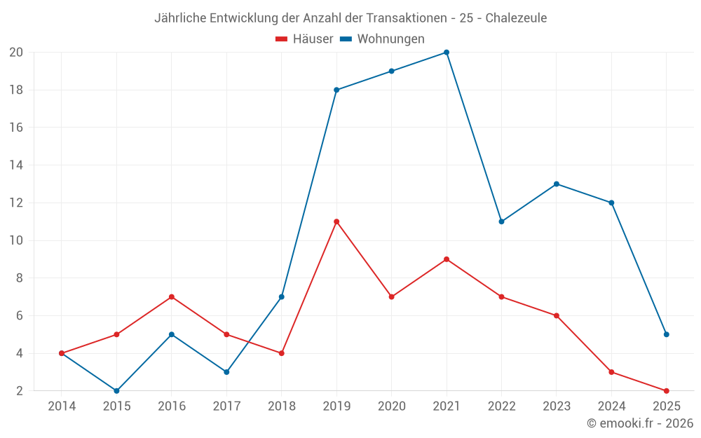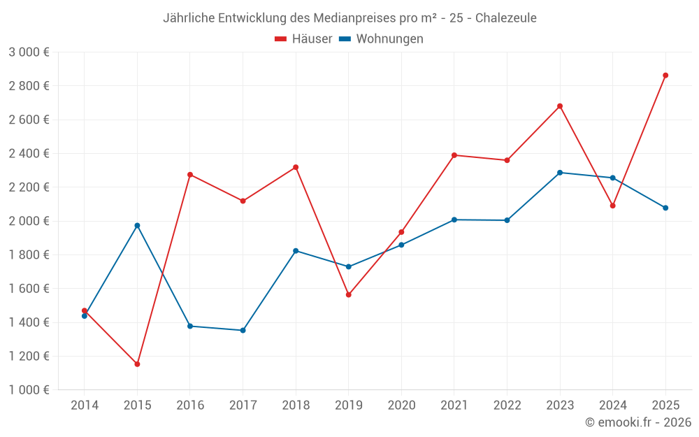 Der Durchschnittspreis auf den 23 Wohnungstransaktionen der letzten 24 Monate in der Gemeinde Chalezeule betrug 2 203 € pro Quadratmeter für einen mittleren Immobilienwert von 130 000 €. Über diesen Zeitraum hinweg lagen 60% der Transaktionen zwischen 1 878 und 2 559 € pro Quadratmeter (vom 2. bis zum 8. Dezil).