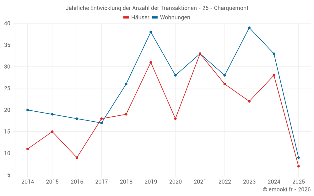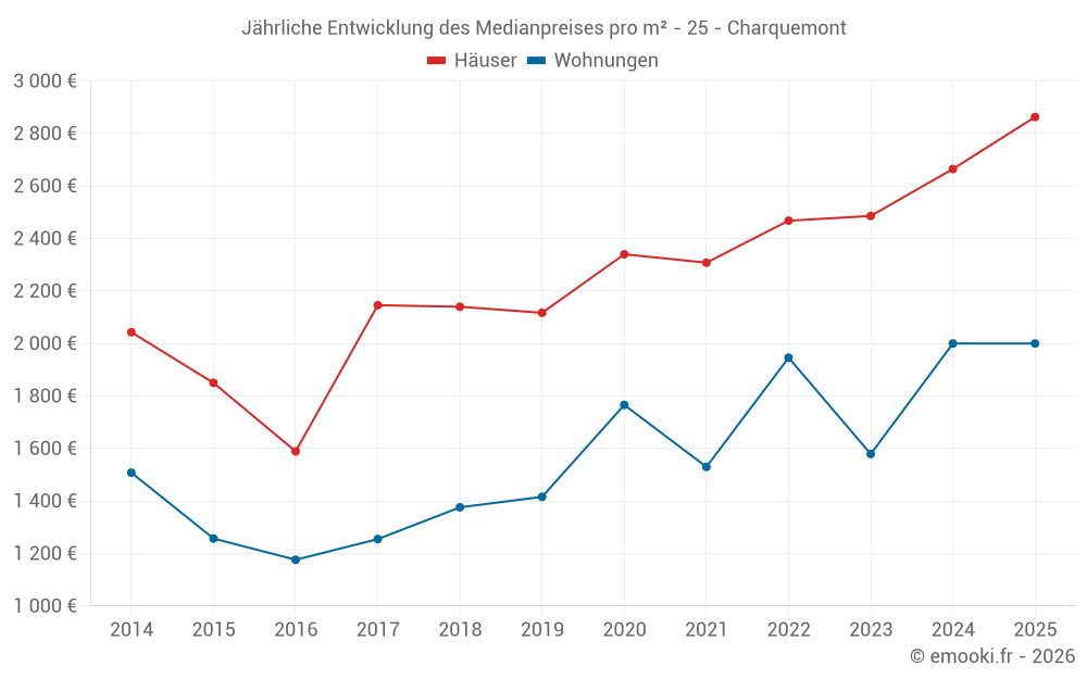 Der Durchschnittspreis auf den 21 Wohnungstransaktionen der letzten 12 Monate in der Gemeinde Charquemont betrug 2 000 € pro Quadratmeter für einen mittleren Immobilienwert von 150 000 €. Über diesen Zeitraum hinweg lagen 60% der Transaktionen zwischen 1 391 und 2 309 € pro Quadratmeter (vom 2. bis zum 8. Dezil).