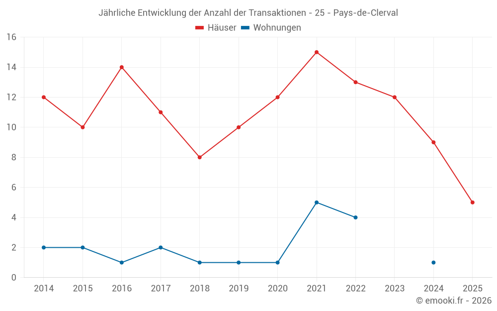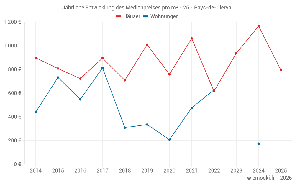 Der Durchschnittspreis auf den 17 Hausgeschäften der letzten 24 Monate in der Gemeinde Pays-de-Clerval betrug 950 € pro Quadratmeter für einen mittleren Immobilienwert von 92 000 €. Über diesen Zeitraum hinweg lagen 60% der Transaktionen zwischen 629 und 1 380 € pro Quadratmeter (vom 2. bis zum 8. Dezil).