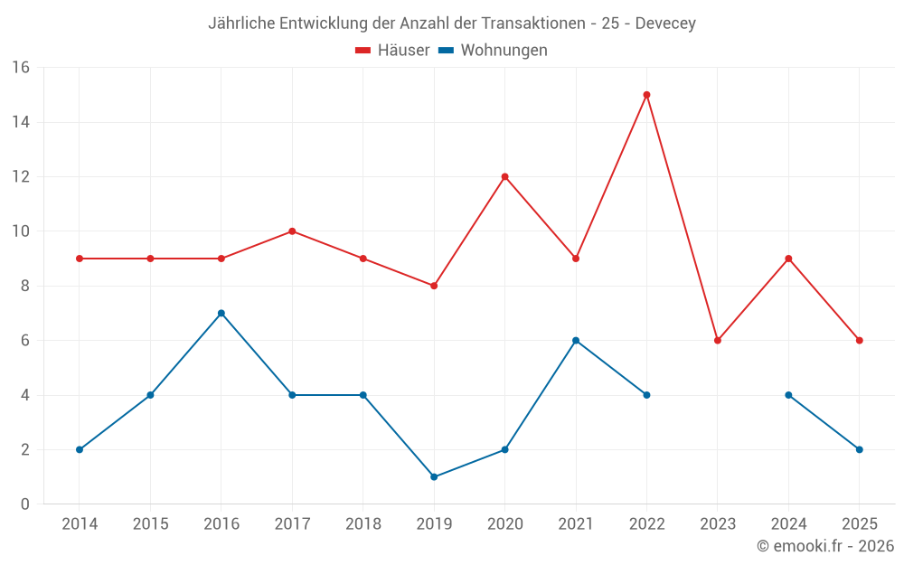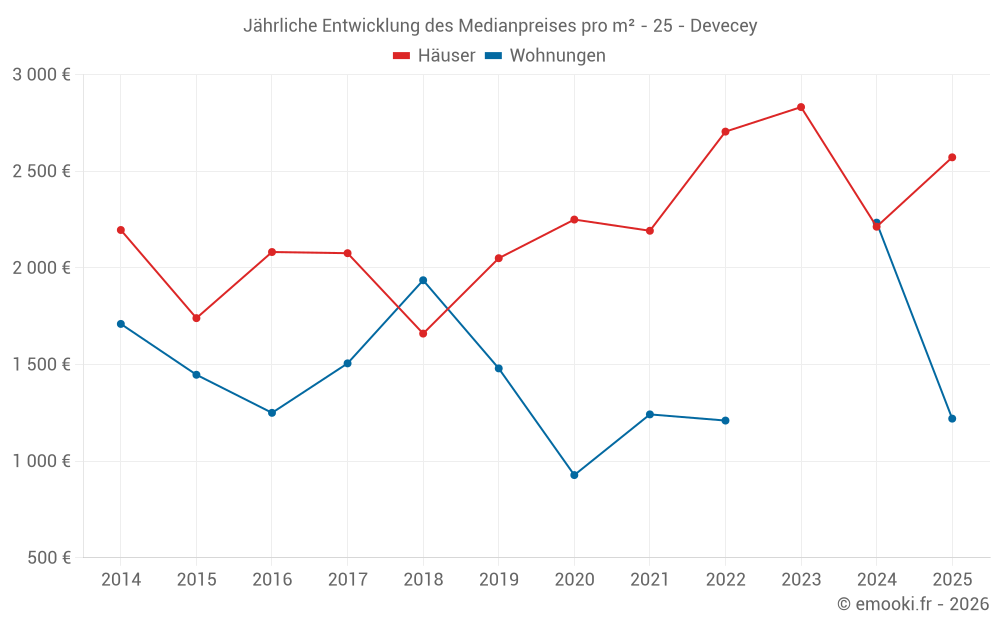 Der Durchschnittspreis auf den 17 Hausgeschäften der letzten 24 Monate in der Gemeinde Devecey betrug 2 534 € pro Quadratmeter für einen mittleren Immobilienwert von 314 700 €. Über diesen Zeitraum hinweg lagen 60% der Transaktionen zwischen 2 190 und 2 670 € pro Quadratmeter (vom 2. bis zum 8. Dezil).