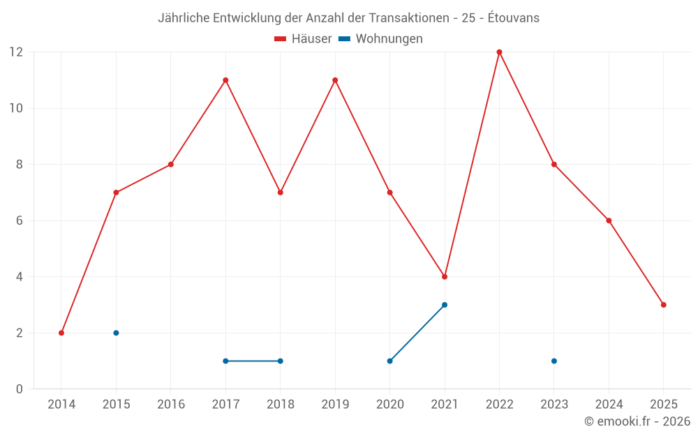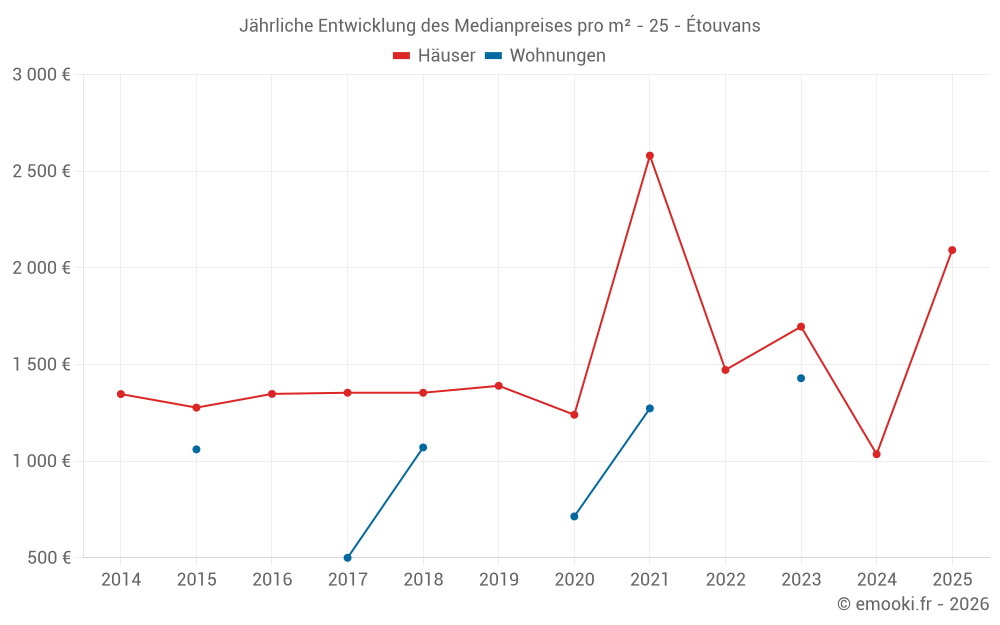 Der Durchschnittspreis auf den 14 Hausgeschäften der letzten 24 Monate in der Gemeinde Étouvans betrug 1 388 € pro Quadratmeter für einen mittleren Immobilienwert von 126 450 €. Über diesen Zeitraum hinweg lagen 60% der Transaktionen zwischen 986 und 2 105 € pro Quadratmeter (vom 2. bis zum 8. Dezil).