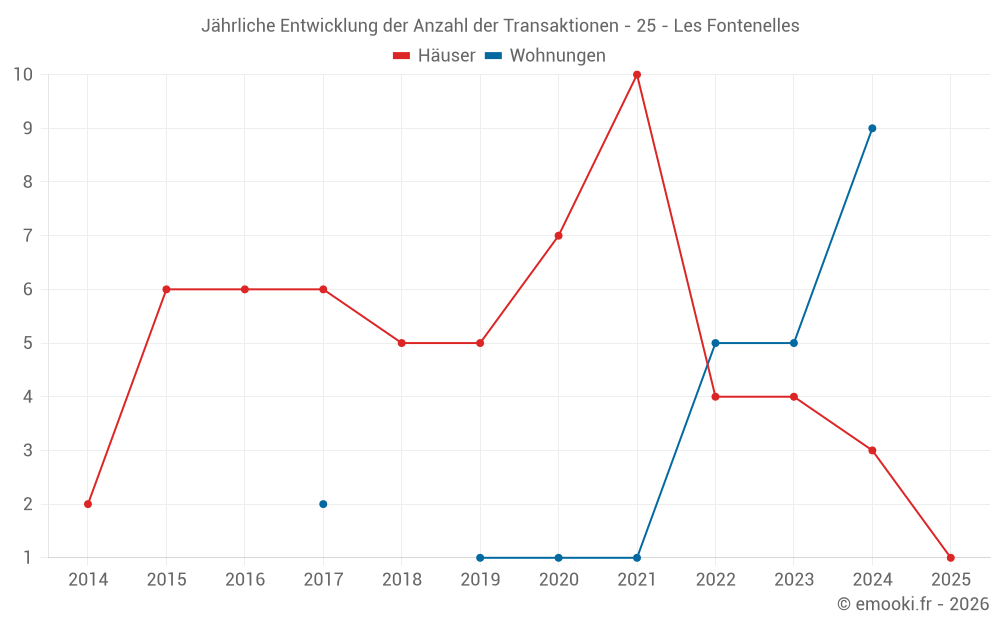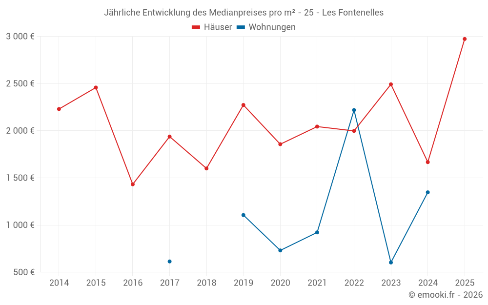 Der Durchschnittspreis auf den 14 Wohnungstransaktionen der letzten 24 Monate in der Gemeinde Les Fontenelles betrug 1 070 € pro Quadratmeter für einen mittleren Immobilienwert von 80 500 €. Über diesen Zeitraum hinweg lagen 60% der Transaktionen zwischen 603 und 1 476 € pro Quadratmeter (vom 2. bis zum 8. Dezil).