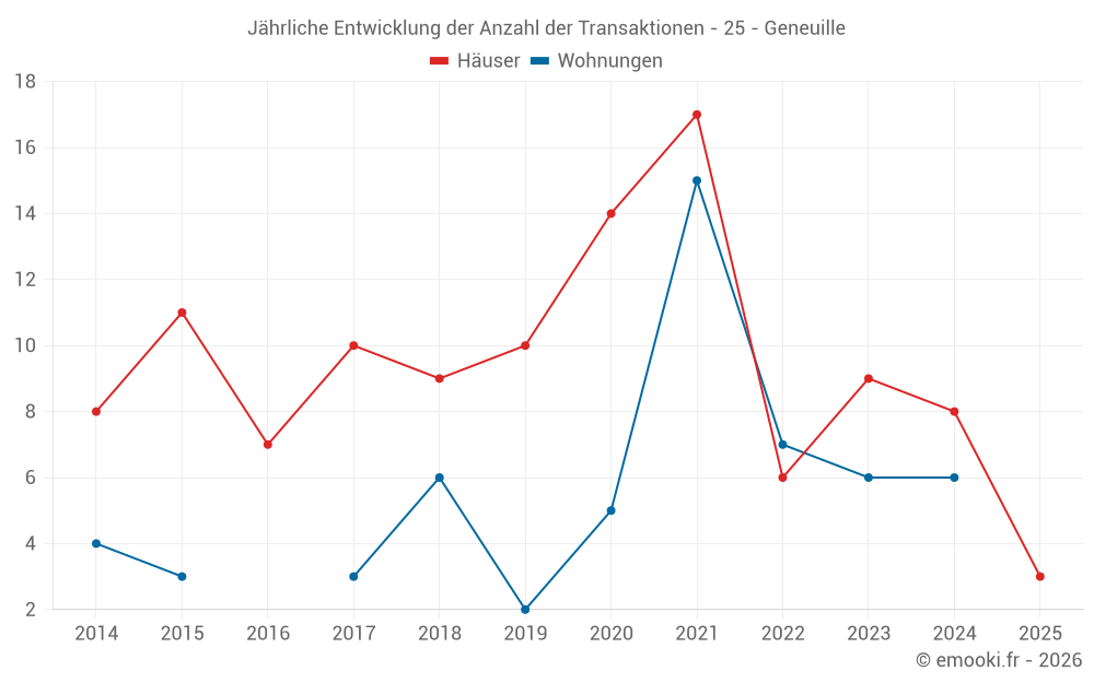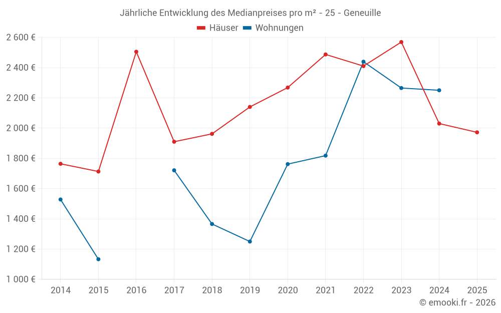 Der Durchschnittspreis auf den 15 Hausgeschäften der letzten 24 Monate in der Gemeinde Geneuille betrug 1 972 € pro Quadratmeter für einen mittleren Immobilienwert von 334 000 €. Über diesen Zeitraum hinweg lagen 60% der Transaktionen zwischen 1 124 und 3 125 € pro Quadratmeter (vom 2. bis zum 8. Dezil).