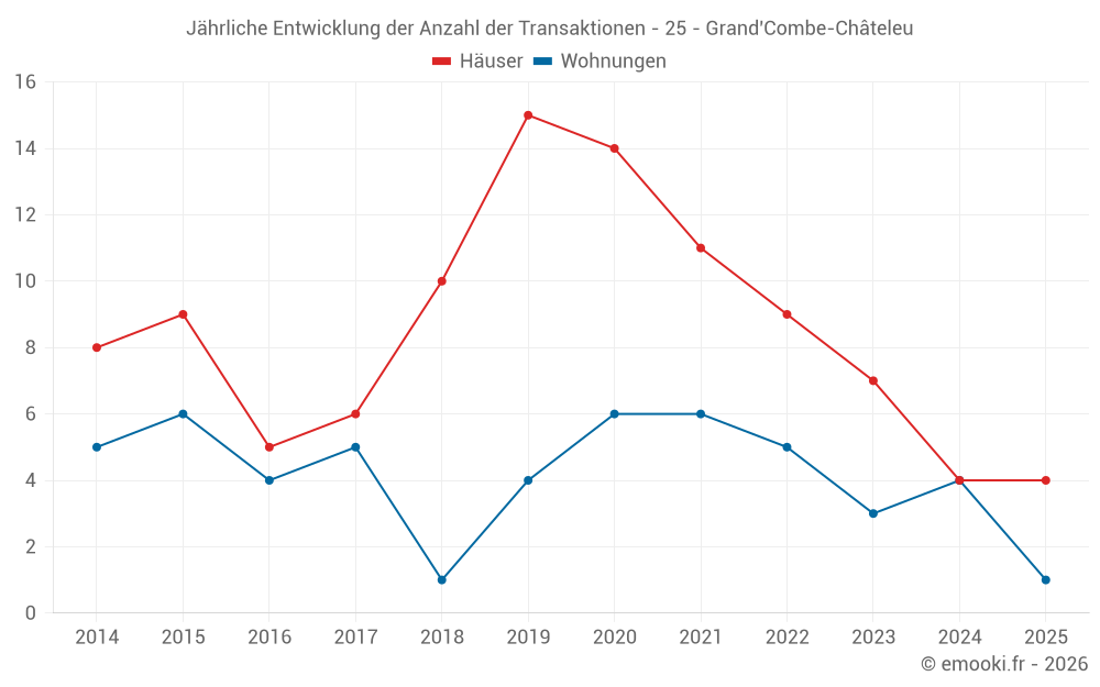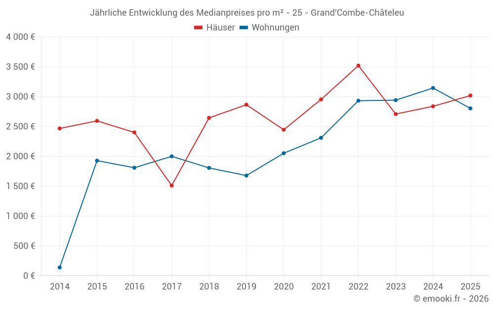 Der Durchschnittspreis auf den 14 Hausgeschäften der letzten 24 Monate in der Gemeinde Grand'Combe-Châteleu betrug 2 773 € pro Quadratmeter für einen mittleren Immobilienwert von 333 795 €. Über diesen Zeitraum hinweg lagen 60% der Transaktionen zwischen 2 097 und 3 362 € pro Quadratmeter (vom 2. bis zum 8. Dezil).