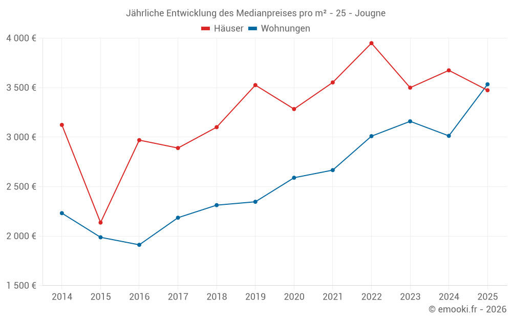 Der Durchschnittspreis auf den 19 Hausgeschäften der letzten 24 Monate in der Gemeinde Jougne betrug 3 664 € pro Quadratmeter für einen mittleren Immobilienwert von 340 000 €. Über diesen Zeitraum hinweg lagen 60% der Transaktionen zwischen 2 921 und 4 649 € pro Quadratmeter (vom 2. bis zum 8. Dezil).