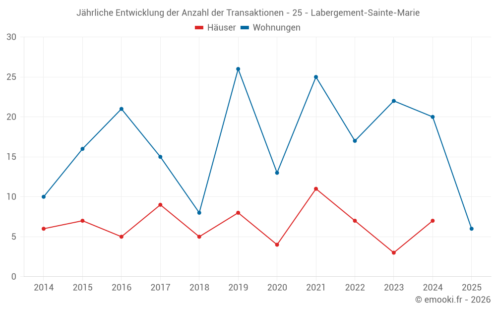 Der Durchschnittspreis auf den 22 Wohnungstransaktionen der letzten 12 Monate in der Gemeinde Labergement-Sainte-Marie betrug 3 426 € pro Quadratmeter für einen mittleren Immobilienwert von 186 750 €. Über diesen Zeitraum hinweg lagen 60% der Transaktionen zwischen 2 599 und 4 122 € pro Quadratmeter (vom 2. bis zum 8. Dezil).