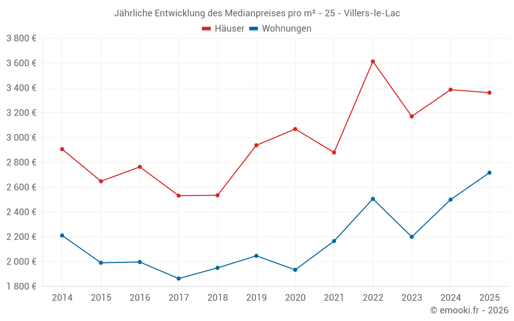 Der Durchschnittspreis auf den 23 Hausgeschäften der letzten 12 Monate in der Gemeinde Villers-le-Lac betrug 3 125 € pro Quadratmeter für einen mittleren Immobilienwert von 346 100 €. Über diesen Zeitraum hinweg lagen 60% der Transaktionen zwischen 2 847 und 3 619 € pro Quadratmeter (vom 2. bis zum 8. Dezil).