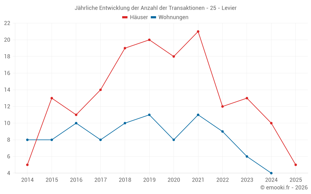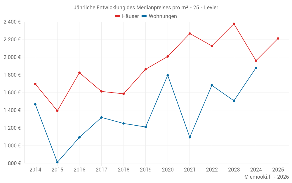 Der Durchschnittspreis auf den 22 Hausgeschäften der letzten 24 Monate in der Gemeinde Levier betrug 2 131 € pro Quadratmeter für einen mittleren Immobilienwert von 215 000 €. Über diesen Zeitraum hinweg lagen 60% der Transaktionen zwischen 1 500 und 2 622 € pro Quadratmeter (vom 2. bis zum 8. Dezil).