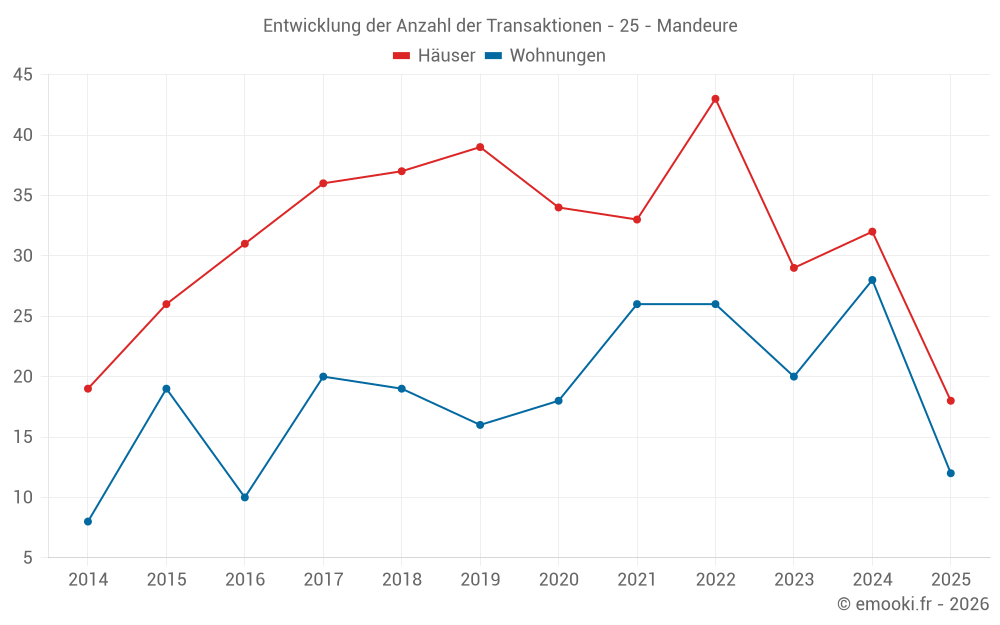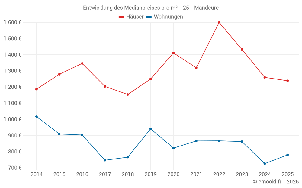 Der Durchschnittspreis auf den 18 Hausgeschäften der letzten 6 Monate in der Gemeinde Mandeure betrug 1 239 € pro Quadratmeter für einen mittleren Immobilienwert von 129 000 €. Über diesen Zeitraum hinweg lagen 60% der Transaktionen zwischen 1 082 und 1 665 € pro Quadratmeter (vom 2. bis zum 8. Dezil).