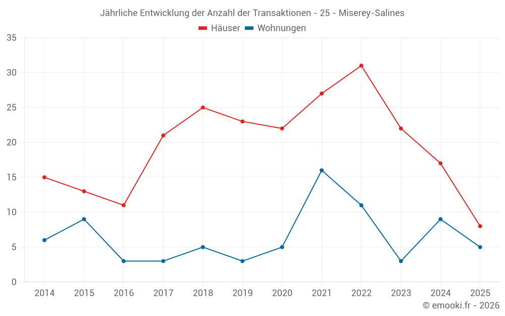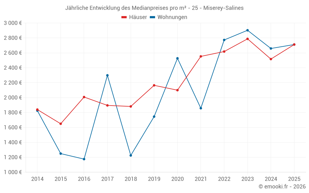 Der Durchschnittspreis auf den 17 Hausgeschäften der letzten 12 Monate in der Gemeinde Miserey-Salines betrug 2 517 € pro Quadratmeter für einen mittleren Immobilienwert von 265 000 €. Über diesen Zeitraum hinweg lagen 60% der Transaktionen zwischen 2 242 und 2 997 € pro Quadratmeter (vom 2. bis zum 8. Dezil).