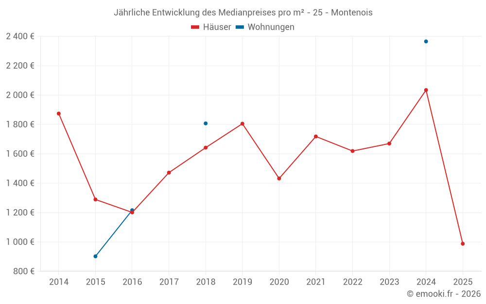 Der Durchschnittspreis auf den 24 Hausgeschäften der letzten 24 Monate in der Gemeinde Montenois betrug 1 478 € pro Quadratmeter für einen mittleren Immobilienwert von 139 000 €. Über diesen Zeitraum hinweg lagen 60% der Transaktionen zwischen 1 028 und 2 261 € pro Quadratmeter (vom 2. bis zum 8. Dezil).