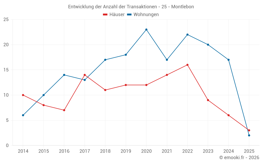 Der Durchschnittspreis auf den 33 Wohnungstransaktionen der letzten 24 Monate in der Gemeinde Montlebon betrug 3 250 € pro Quadratmeter für einen mittleren Immobilienwert von 249 250 €. Über diesen Zeitraum hinweg lagen 60% der Transaktionen zwischen 2 140 und 3 708 € pro Quadratmeter (vom 2. bis zum 8. Dezil).