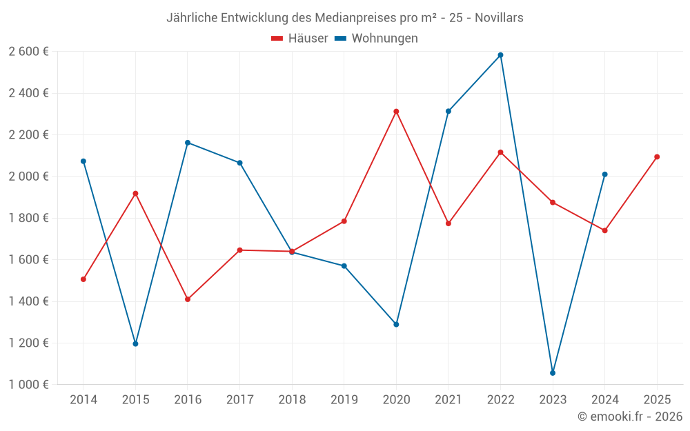 Der Durchschnittspreis auf den 17 Hausgeschäften der letzten 24 Monate in der Gemeinde Novillars betrug 1 796 € pro Quadratmeter für einen mittleren Immobilienwert von 200 000 €. Über diesen Zeitraum hinweg lagen 60% der Transaktionen zwischen 1 288 und 2 146 € pro Quadratmeter (vom 2. bis zum 8. Dezil).