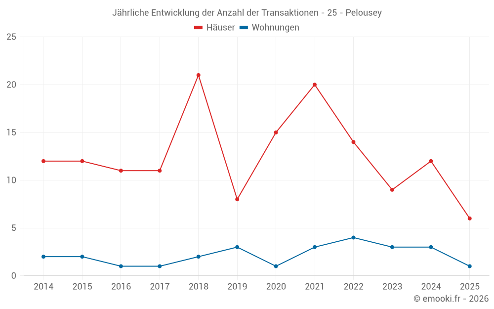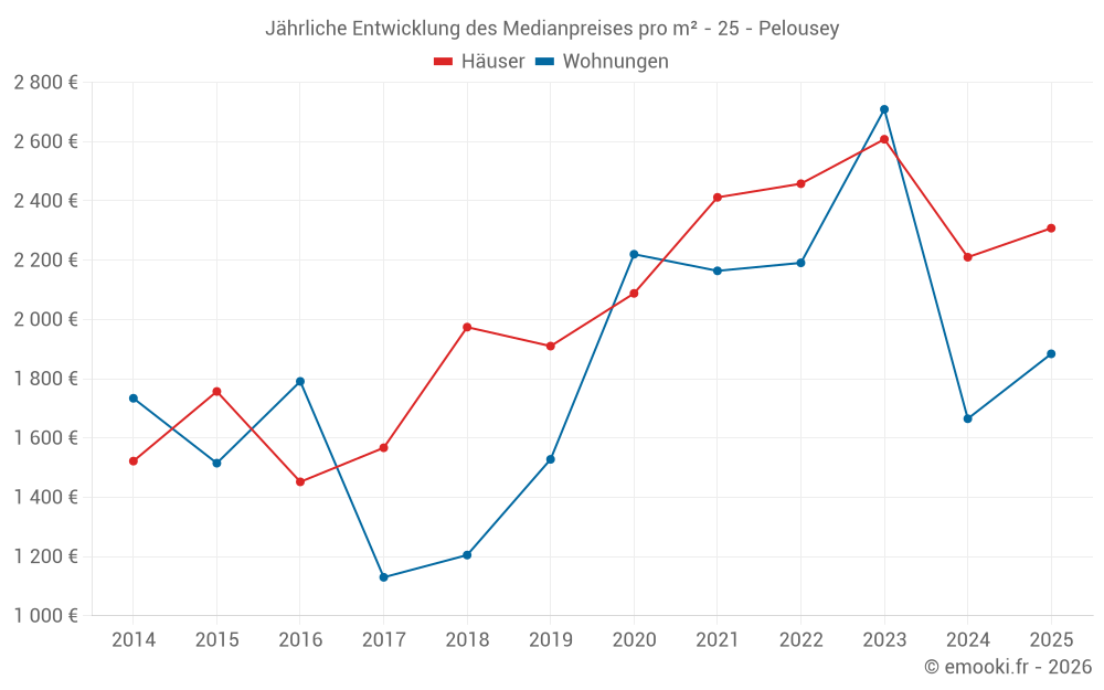 Der Durchschnittspreis auf den 24 Hausgeschäften der letzten 24 Monate in der Gemeinde Pelousey betrug 2 370 € pro Quadratmeter für einen mittleren Immobilienwert von 219 500 €. Über diesen Zeitraum hinweg lagen 60% der Transaktionen zwischen 1 649 und 2 743 € pro Quadratmeter (vom 2. bis zum 8. Dezil).