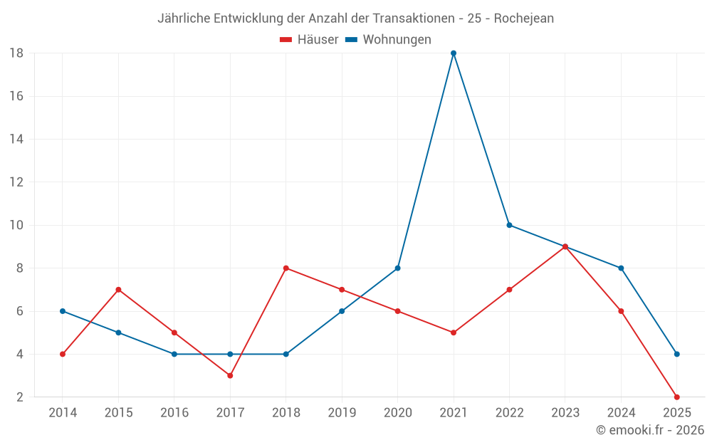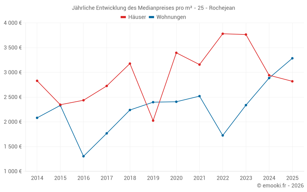 Der Durchschnittspreis auf den 17 Wohnungstransaktionen der letzten 24 Monate in der Gemeinde Rochejean betrug 2 967 € pro Quadratmeter für einen mittleren Immobilienwert von 152 000 €. Über diesen Zeitraum hinweg lagen 60% der Transaktionen zwischen 2 126 und 3 550 € pro Quadratmeter (vom 2. bis zum 8. Dezil).