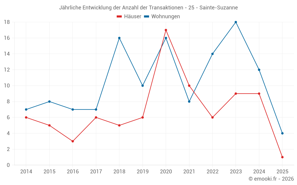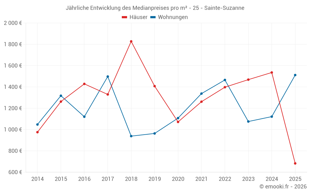 Der Durchschnittspreis auf den 26 Wohnungstransaktionen der letzten 24 Monate in der Gemeinde Sainte-Suzanne betrug 1 146 € pro Quadratmeter für einen mittleren Immobilienwert von 68 150 €. Über diesen Zeitraum hinweg lagen 60% der Transaktionen zwischen 980 und 1 754 € pro Quadratmeter (vom 2. bis zum 8. Dezil).