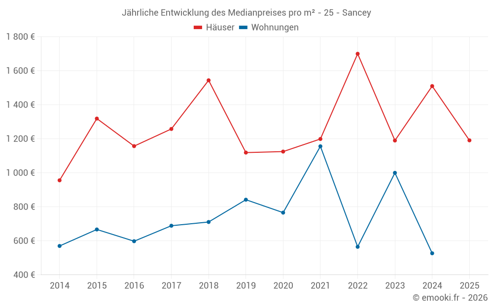 Der Durchschnittspreis auf den 19 Hausgeschäften der letzten 24 Monate in der Gemeinde Sancey betrug 1 468 € pro Quadratmeter für einen mittleren Immobilienwert von 172 100 €. Über diesen Zeitraum hinweg lagen 60% der Transaktionen zwischen 796 und 1 952 € pro Quadratmeter (vom 2. bis zum 8. Dezil).