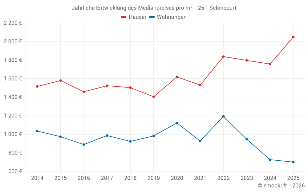 Der Durchschnittspreis auf den 30 Hausgeschäften der letzten 12 Monate in der Gemeinde Seloncourt betrug 1 778 € pro Quadratmeter für einen mittleren Immobilienwert von 165 548 €. Über diesen Zeitraum hinweg lagen 60% der Transaktionen zwischen 1 014 und 2 410 € pro Quadratmeter (vom 2. bis zum 8. Dezil).