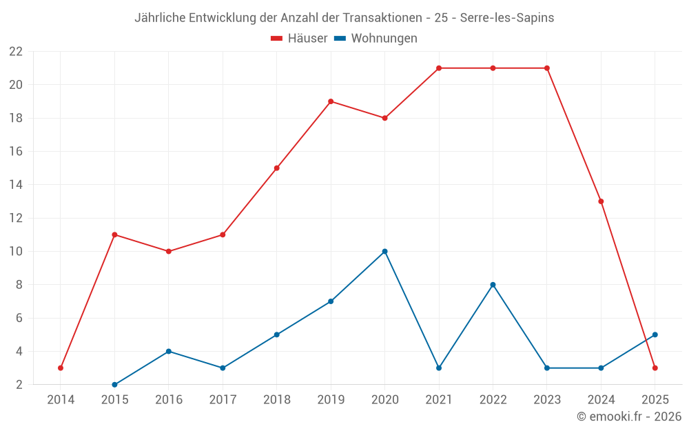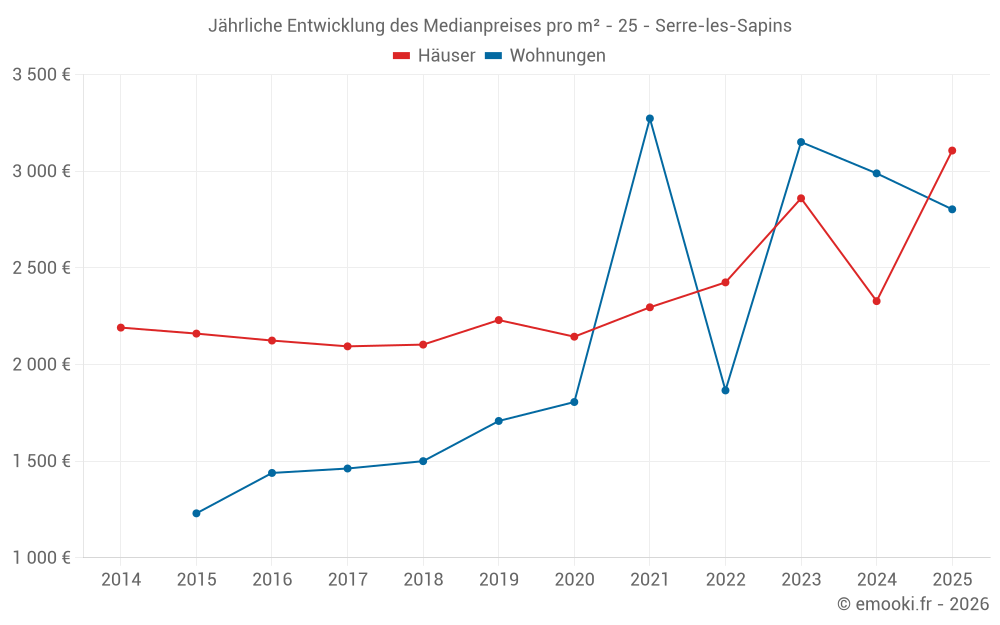 Der Durchschnittspreis auf den 29 Hausgeschäften der letzten 24 Monate in der Gemeinde Serre-les-Sapins betrug 2 642 € pro Quadratmeter für einen mittleren Immobilienwert von 295 000 €. Über diesen Zeitraum hinweg lagen 60% der Transaktionen zwischen 2 025 und 3 064 € pro Quadratmeter (vom 2. bis zum 8. Dezil).