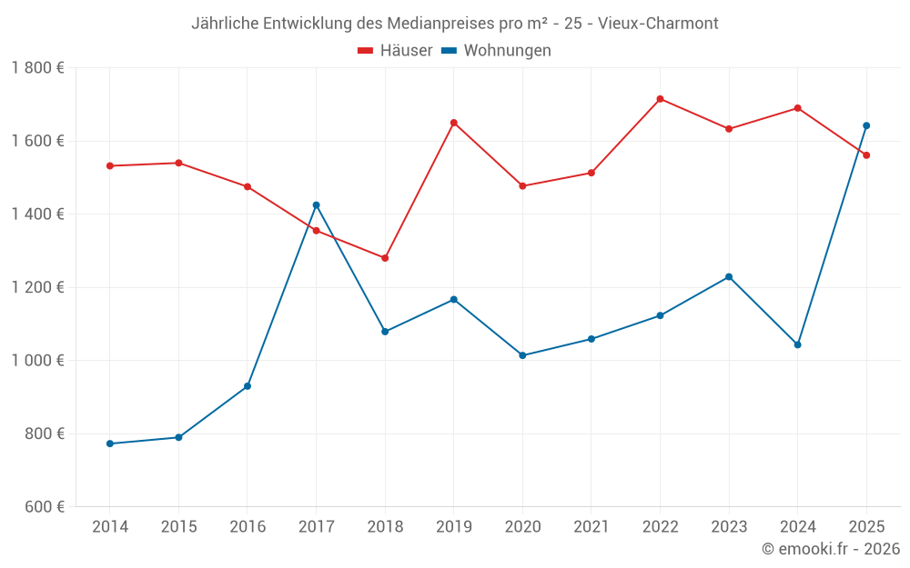 Der Durchschnittspreis auf den 28 Hausgeschäften der letzten 24 Monate in der Gemeinde Vieux-Charmont betrug 1 690 € pro Quadratmeter für einen mittleren Immobilienwert von 136 895 €. Über diesen Zeitraum hinweg lagen 60% der Transaktionen zwischen 1 356 und 2 196 € pro Quadratmeter (vom 2. bis zum 8. Dezil).