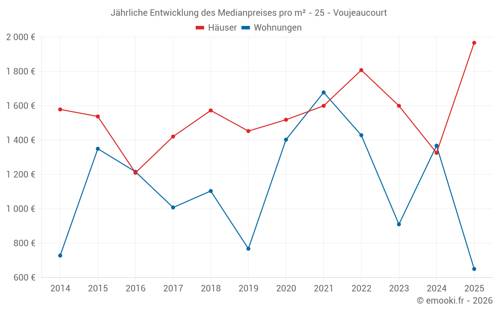 Der Durchschnittspreis auf den 17 Wohnungstransaktionen der letzten 24 Monate in der Gemeinde Voujeaucourt betrug 929 € pro Quadratmeter für einen mittleren Immobilienwert von 87 000 €. Über diesen Zeitraum hinweg lagen 60% der Transaktionen zwischen 691 und 1 370 € pro Quadratmeter (vom 2. bis zum 8. Dezil).