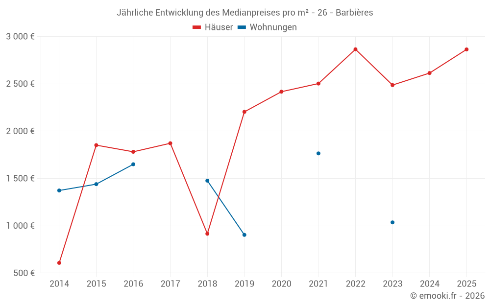 Der Durchschnittspreis auf den 17 Hausgeschäften der letzten 12 Monate in der Gemeinde Barbières betrug 2 885 € pro Quadratmeter für einen mittleren Immobilienwert von 288 500 €. Über diesen Zeitraum hinweg lagen 60% der Transaktionen zwischen 2 250 und 3 288 € pro Quadratmeter (vom 2. bis zum 8. Dezil).