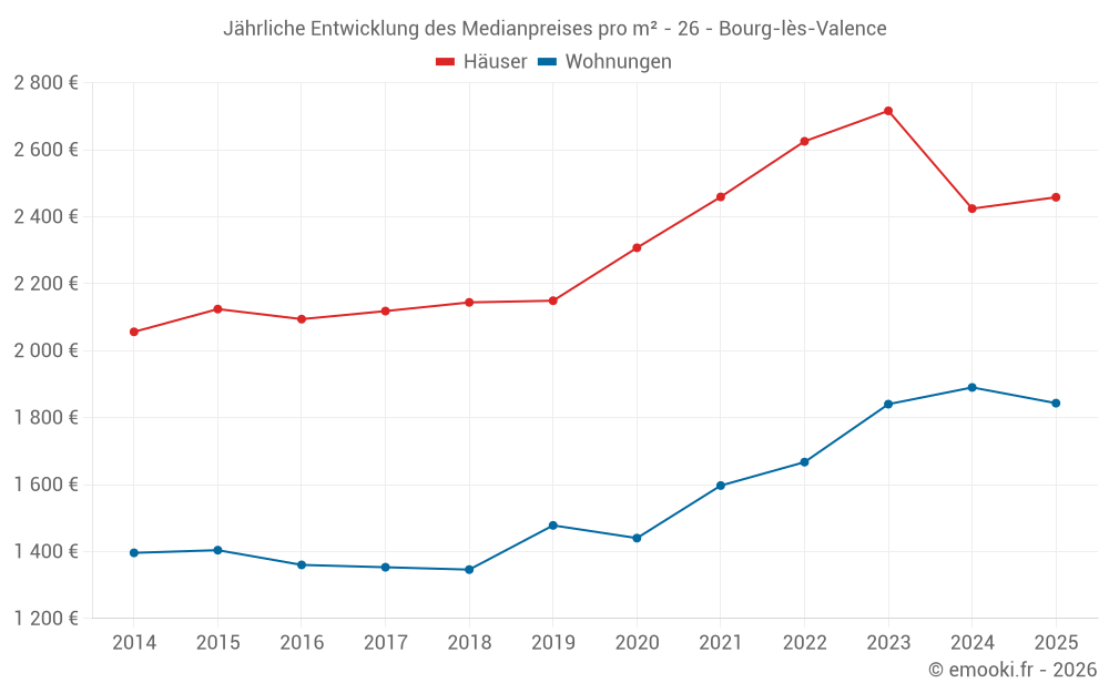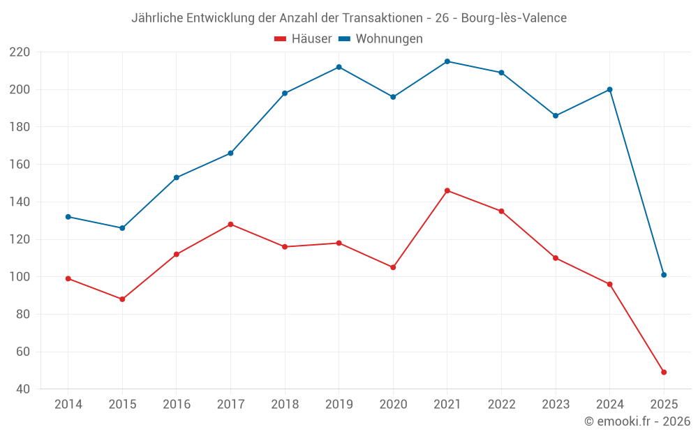 Der Durchschnittspreis auf den 49 Hausgeschäften der letzten 6 Monate in der Gemeinde Bourg-lès-Valence betrug 2 458 € pro Quadratmeter für einen mittleren Immobilienwert von 247 000 €. Über diesen Zeitraum hinweg lagen 60% der Transaktionen zwischen 1 851 und 3 019 € pro Quadratmeter (vom 2. bis zum 8. Dezil).