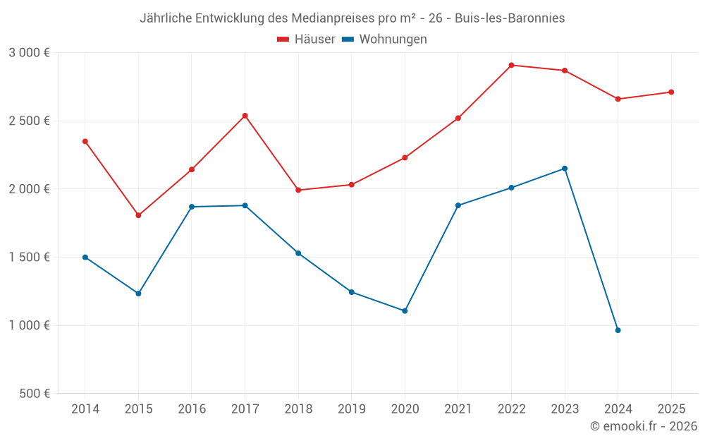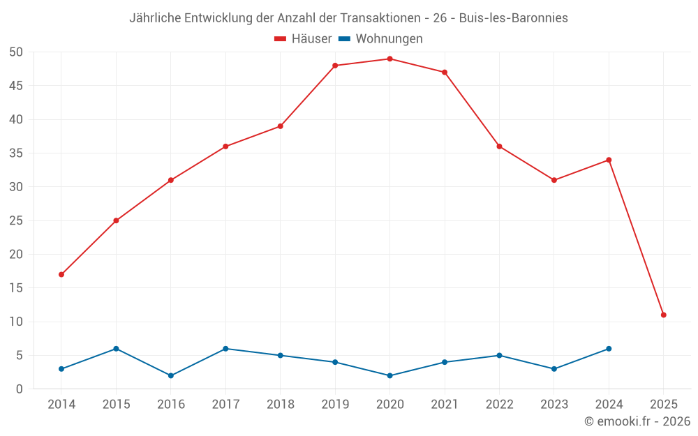 Der Durchschnittspreis auf den 27 Hausgeschäften der letzten 12 Monate in der Gemeinde Buis-les-Baronnies betrug 2 711 € pro Quadratmeter für einen mittleren Immobilienwert von 190 000 €. Über diesen Zeitraum hinweg lagen 60% der Transaktionen zwischen 2 051 und 3 640 € pro Quadratmeter (vom 2. bis zum 8. Dezil).