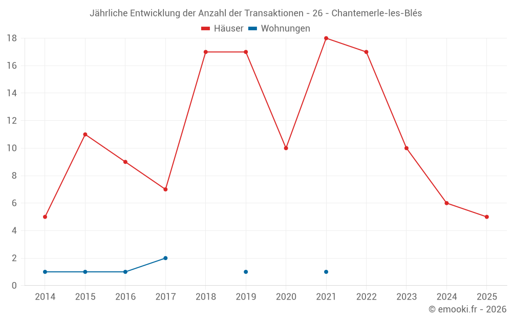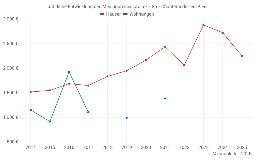 Der Durchschnittspreis auf den 15 Hausgeschäften der letzten 24 Monate in der Gemeinde Chantemerle-les-Blés betrug 2 523 € pro Quadratmeter für einen mittleren Immobilienwert von 257 000 €. Über diesen Zeitraum hinweg lagen 60% der Transaktionen zwischen 1 784 und 3 067 € pro Quadratmeter (vom 2. bis zum 8. Dezil).