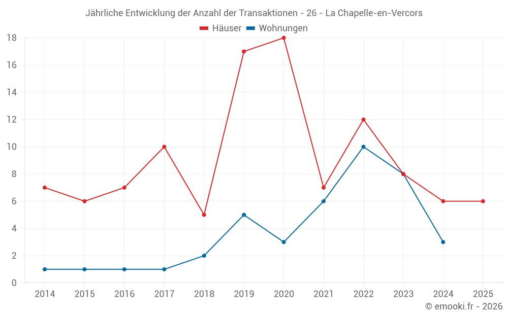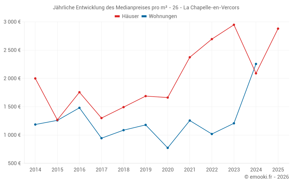 Der Durchschnittspreis auf den 17 Hausgeschäften der letzten 24 Monate in der Gemeinde La Chapelle-en-Vercors betrug 2 766 € pro Quadratmeter für einen mittleren Immobilienwert von 200 000 €. Über diesen Zeitraum hinweg lagen 60% der Transaktionen zwischen 1 611 und 3 059 € pro Quadratmeter (vom 2. bis zum 8. Dezil).