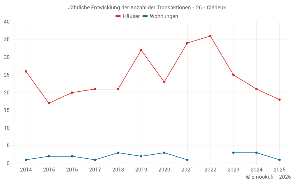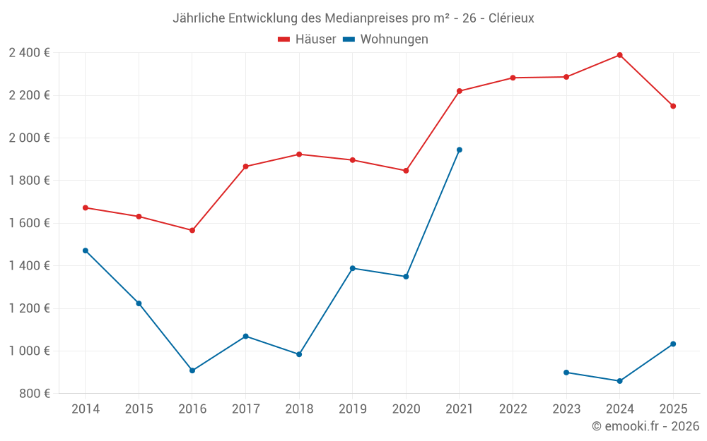 Der Durchschnittspreis auf den 18 Hausgeschäften der letzten 6 Monate in der Gemeinde Clérieux betrug 2 149 € pro Quadratmeter für einen mittleren Immobilienwert von 211 875 €. Über diesen Zeitraum hinweg lagen 60% der Transaktionen zwischen 1 483 und 2 671 € pro Quadratmeter (vom 2. bis zum 8. Dezil).
