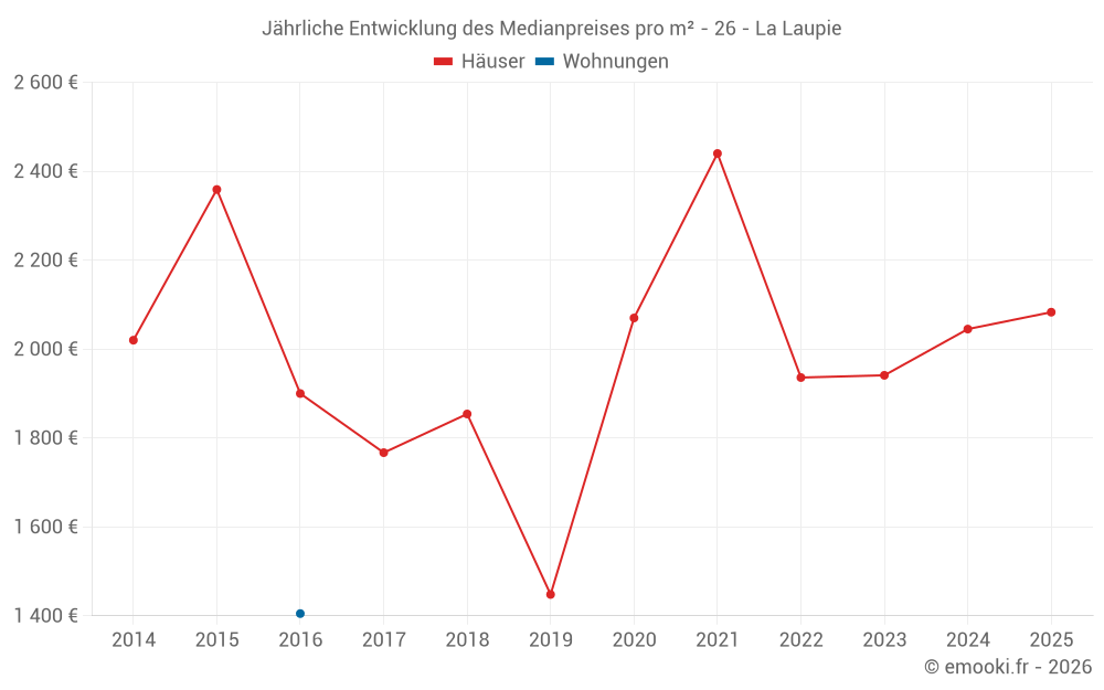 Der Durchschnittspreis auf den 14 Hausgeschäften der letzten 24 Monate in der Gemeinde La Laupie betrug 2 064 € pro Quadratmeter für einen mittleren Immobilienwert von 184 525 €. Über diesen Zeitraum hinweg lagen 60% der Transaktionen zwischen 1 210 und 2 535 € pro Quadratmeter (vom 2. bis zum 8. Dezil).