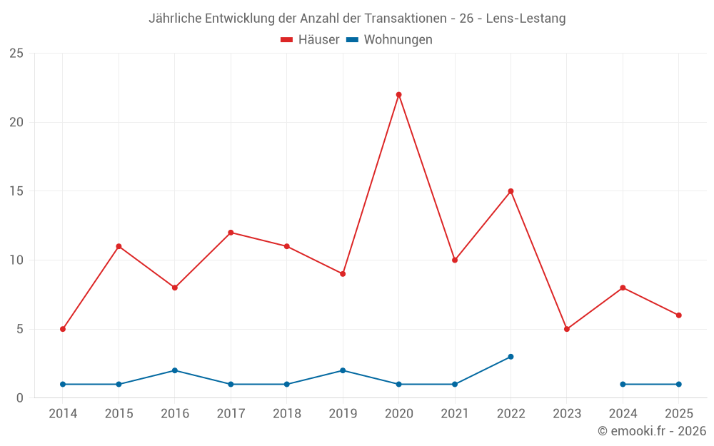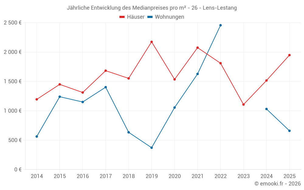 Der Durchschnittspreis auf den 17 Hausgeschäften der letzten 24 Monate in der Gemeinde Lens-Lestang betrug 1 662 € pro Quadratmeter für einen mittleren Immobilienwert von 169 300 €. Über diesen Zeitraum hinweg lagen 60% der Transaktionen zwischen 1 108 und 2 047 € pro Quadratmeter (vom 2. bis zum 8. Dezil).